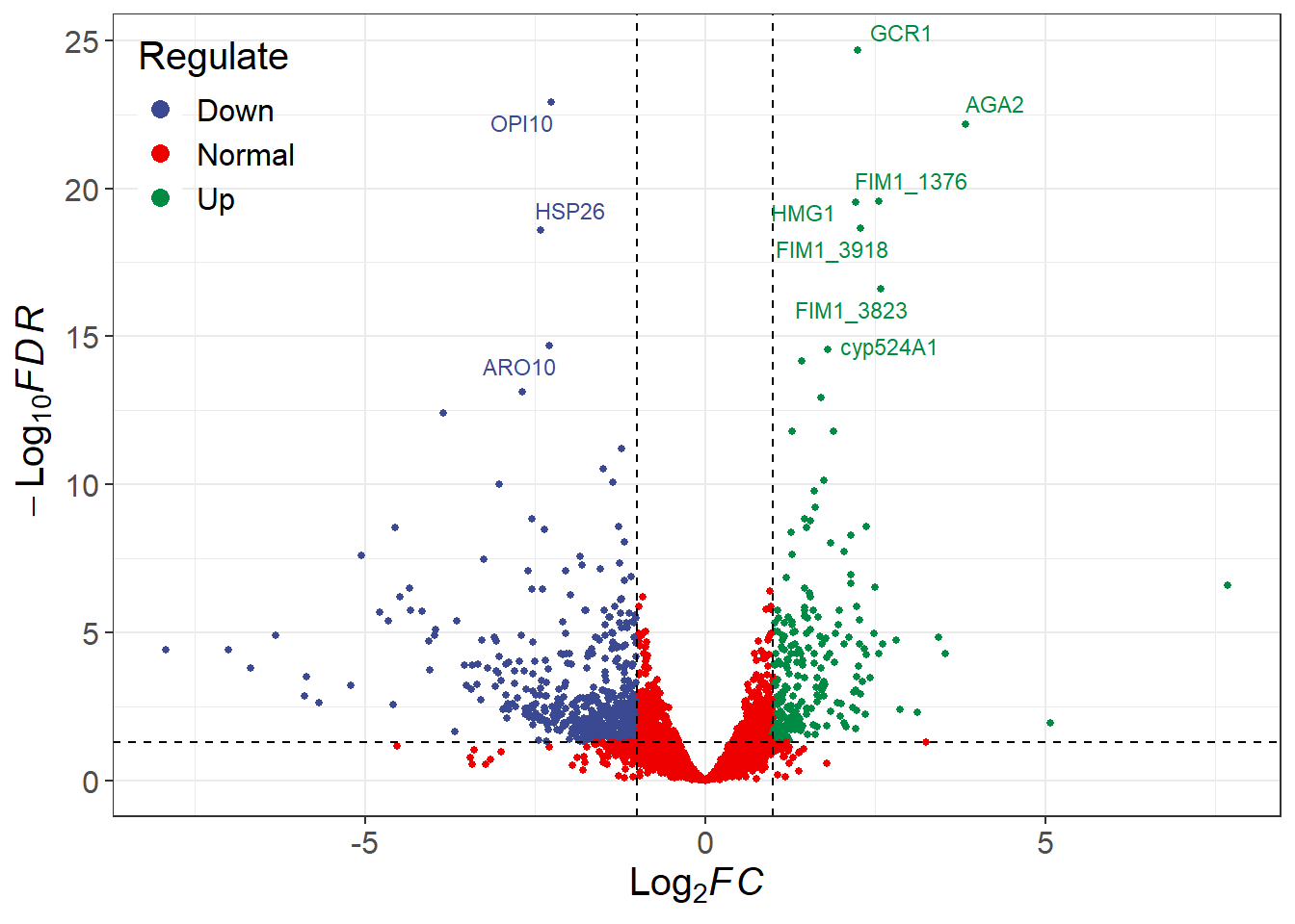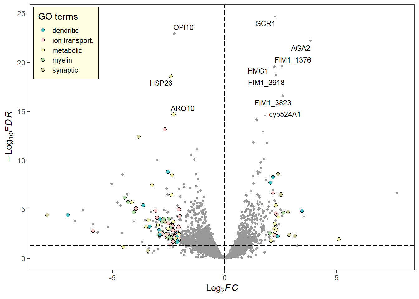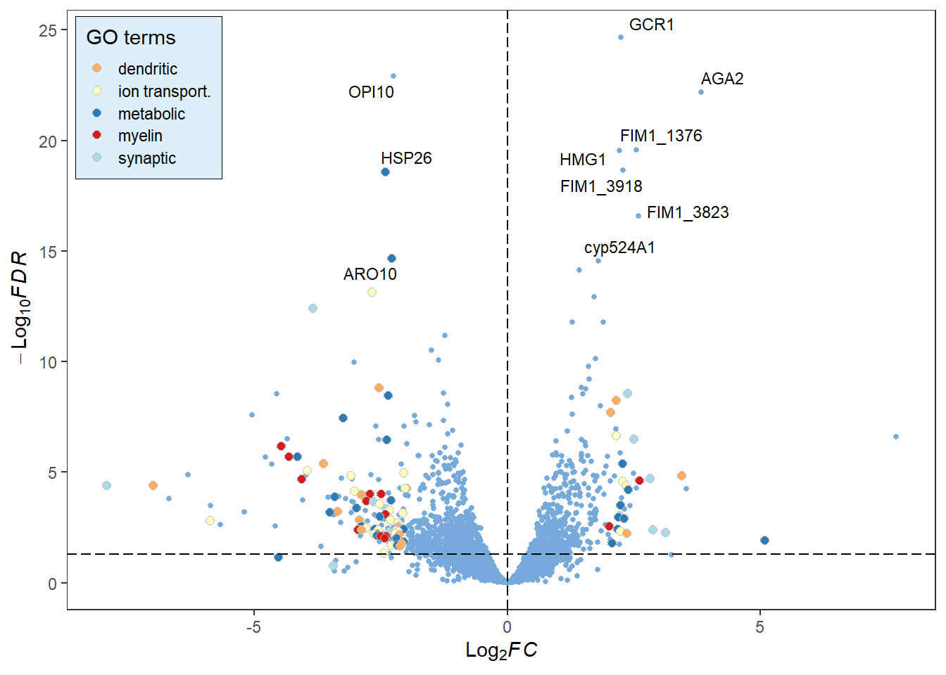 library(RColorBrewer)# Change the fill and color manually:deg_point_fill <-brewer.pal(5, "RdYlBu")names(deg_point_fill) <-unique(term_data$term)term_volcano(data, term_data,x ="log2FoldChange", y ="padj",normal_point_color ="#75aadb",deg_point_fill = deg_point_fill,deg_point_color ="grey",legend_background_fill ="#deeffc",label ="row", label_number =10, output =FALSE)
